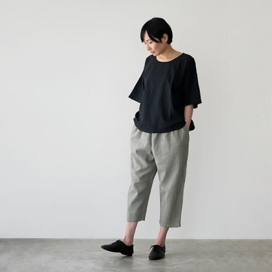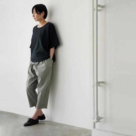 ヒップ周りにたっぷりと余裕を持たせ裾にかけてすっきりと細くなった、身体のラインを拾わない嬉しいシルエット。