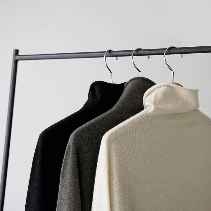 繊維を傷めない低温での染色加工を施して、カシミヤ本来のやさしく柔らかな風合いはそのままに、縫い目のあたりがないシームレスで仕立てられています。