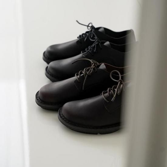 デザインはシンプルな外羽根のダービーシューズですが、アッパーにはベジタブルタンニンなめしのカーフレザーを用い、履きこんでからの風合いの変化が楽しみな素材構成となっています。
