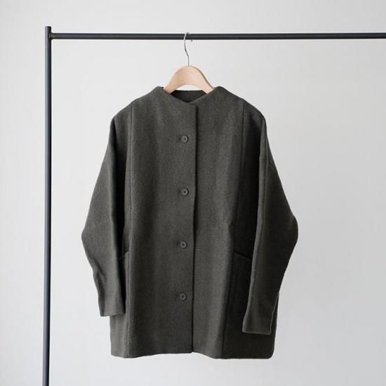 ゆったりとした着心地のショートコートは気軽に着ていただけるデザインながら少し立ち上がったネックラインが上品な印象です。