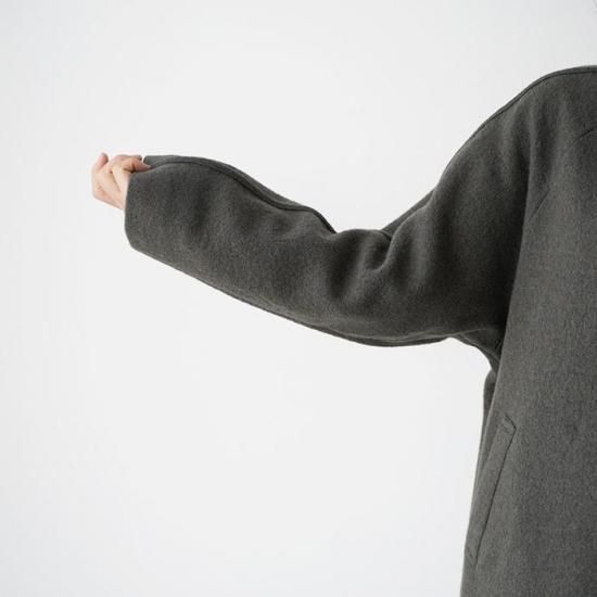 少し立ち上がったネックラインとゆったりと長めの着丈が上品なロングコート。