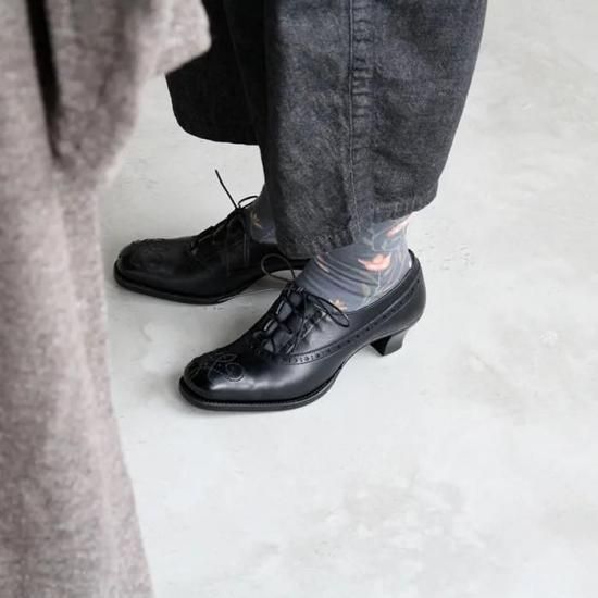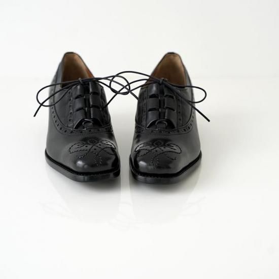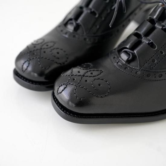 デザインはスクエアトゥにメダリオンステッチをあしらったクラシカルな雰囲気のパンプス。